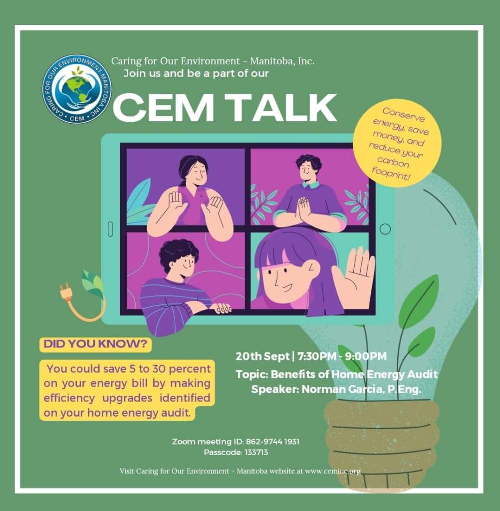 Caring for our Environment-Manitoba (CEM) Inc. cordially invites you to its FREE virtual CEM Talk which is taking place on Tuesday, September 20, 7:30 PM – 9:00 PM. Topic for discussion focuses on the “Benefits of Home Energy Audit”